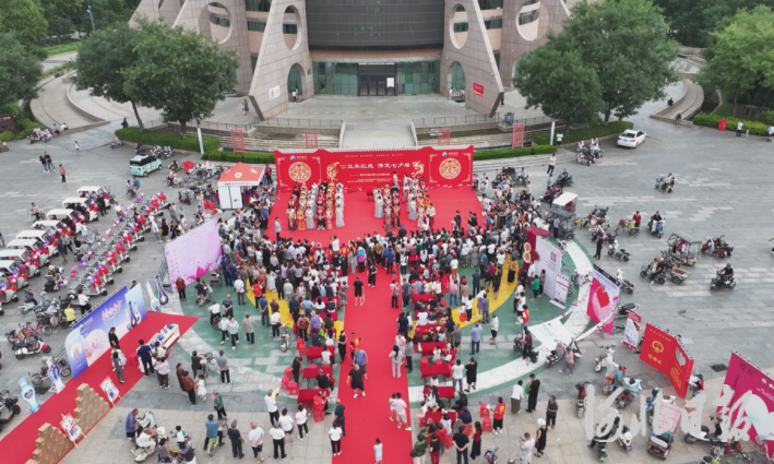 “看,好多接亲的队伍!太热闹了!”现场群众的赞叹声此起彼伏。迎亲环节率先开启,19对新人按照指定路线从新世纪广场出发,沿途吸引不少市民驻足祝福,最终再回到新世纪广场。在喜娘的引导下,新人们依次完成跨马鞍、跨火盆、触苹果等传统仪式。婚礼仪式环节,证婚人上台为新人送上祝福,并见证新人共系同心结、同饮合卺酒、共签婚书,现场掌声与欢呼声交织。