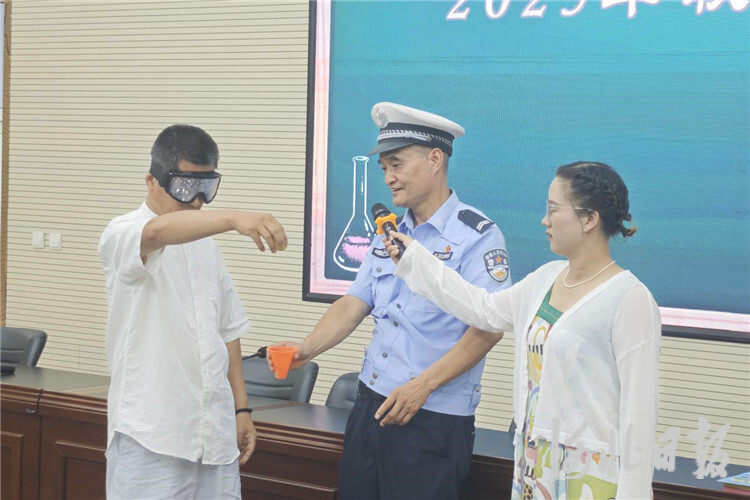 在互动环节中,民警指导学生识别交通标识,并通过酒驾模拟眼镜,让学生直观感受饮酒后判断力、操作力下降的状态,深化学生“禁止酒醉驾”理念。最后,民警通过播放典型事故视频,展示横穿马路、闯红灯等行为的严重后果,引导学生杜绝危险行为。