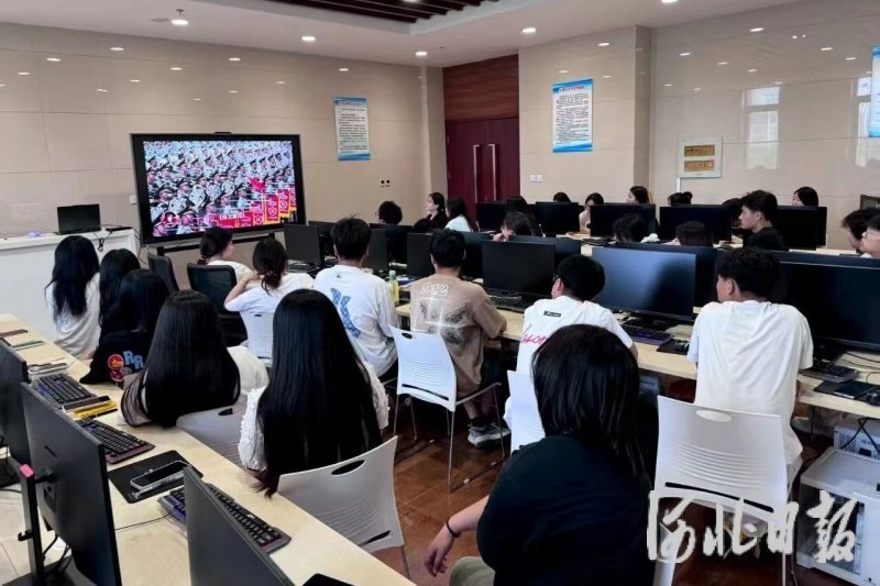 图为曹妃甸职业技术学院学生收看纪念中国人民抗日战争暨世界反法西斯战争胜利80周年大会直播。