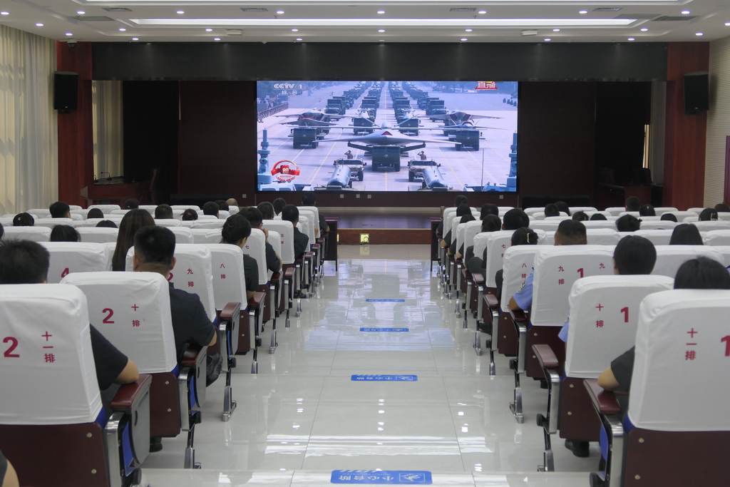 干警们目不转睛地注视着屏幕,被三军将士整齐的步伐、威武的军容所震撼,为国家的强大和军队的现代化建设成就感到无比骄傲和自豪。