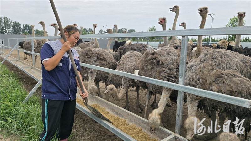 8月15日,西南合村鸵鸟育苗养殖基地的饲养员在给鸵鸟喂食。河北日报、河北日报客户端记者林凤斌摄