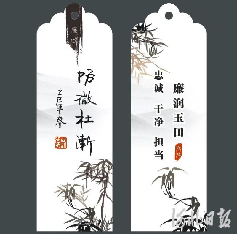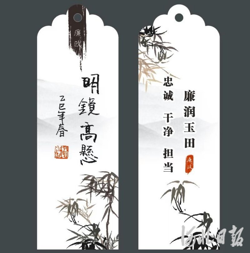 河北日报客户端讯(张敏慧)“小小书签常伴案头,字字箴言警钟长鸣。这不仅是书签,更是一面‘随身镜’,提醒我时时擦拭初心,永葆本色,在潜移默化中受到廉政教育。”近日,河北省玉田县一名纪检监察干部手捧别致的廉政书签时说。