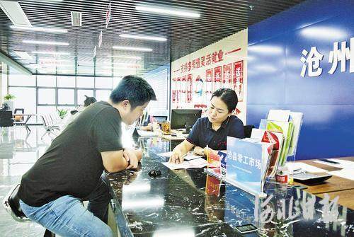 9月2日,在沧县零工市场的服务大厅里,求职者(左)正在向工作人员咨询。