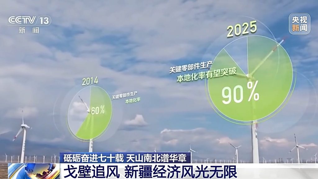2012年开始,哈密加快布局风电产业。先后引入14家规模以上风电企业,建设3个风电产业园,构建起新疆规模最大、产业链最全的风电装备制造基地。这个旋转的风机上,2014年,关键零部件生产本地化率60%,今年这一数字有望突破90%。