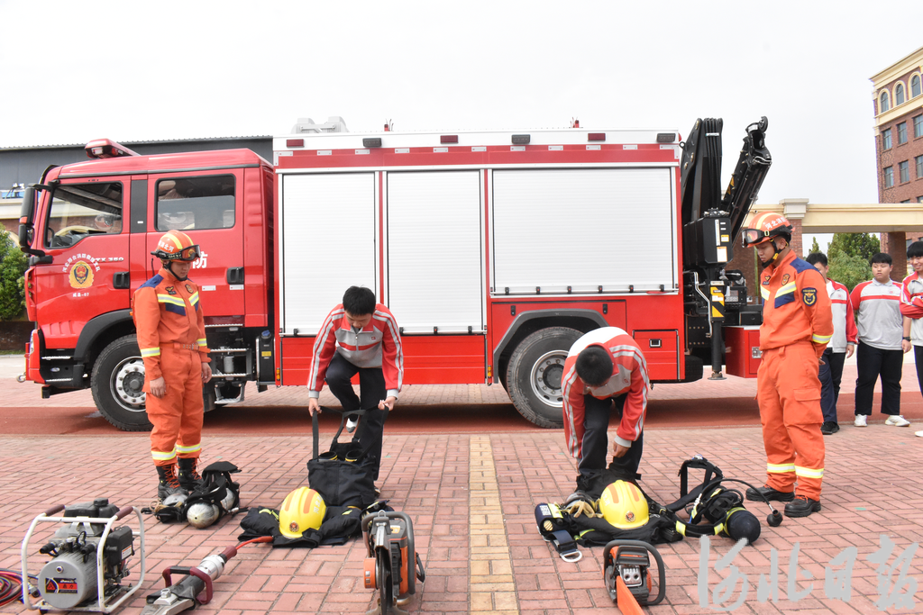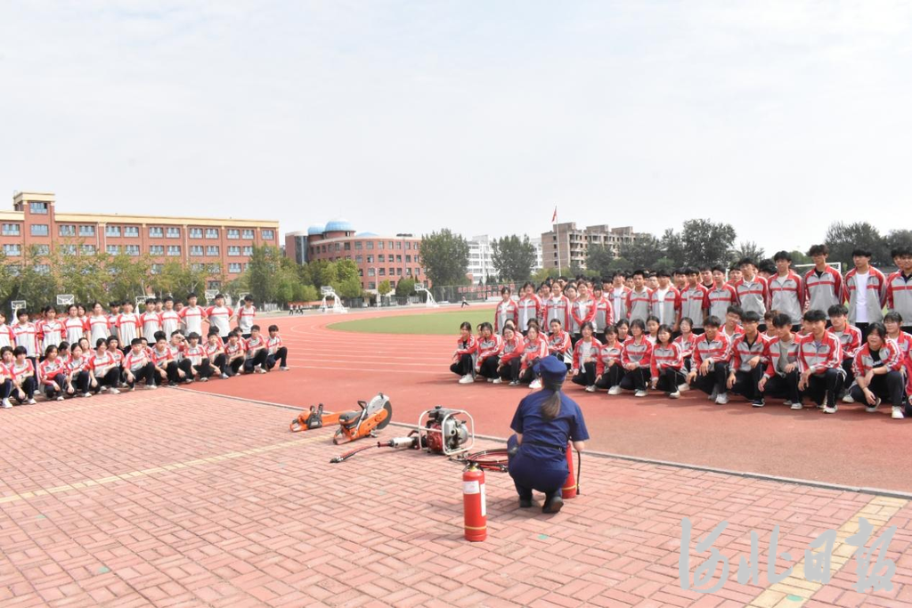 9月12日,威县消防救援大队消防宣传员为该县第二中学学生展示消防器材。