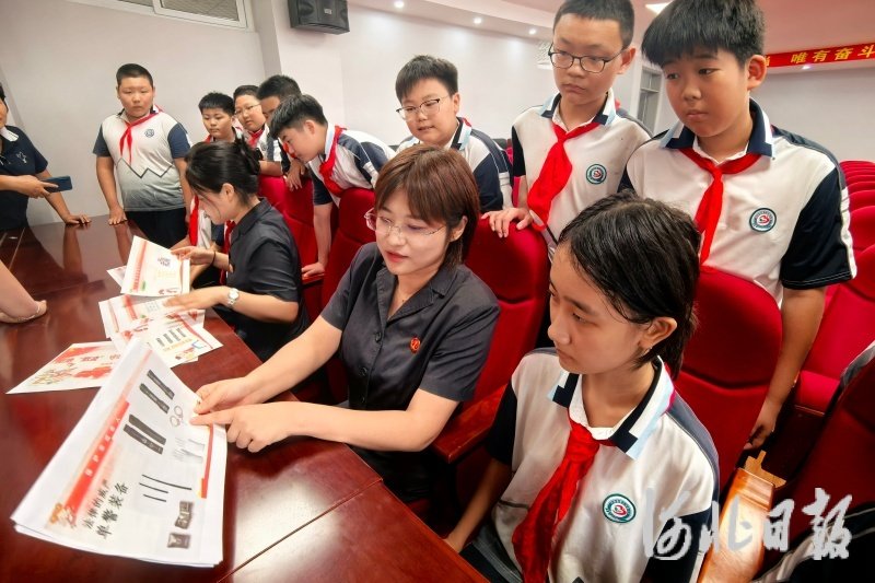 图为司法人员给学生讲解法警装备。