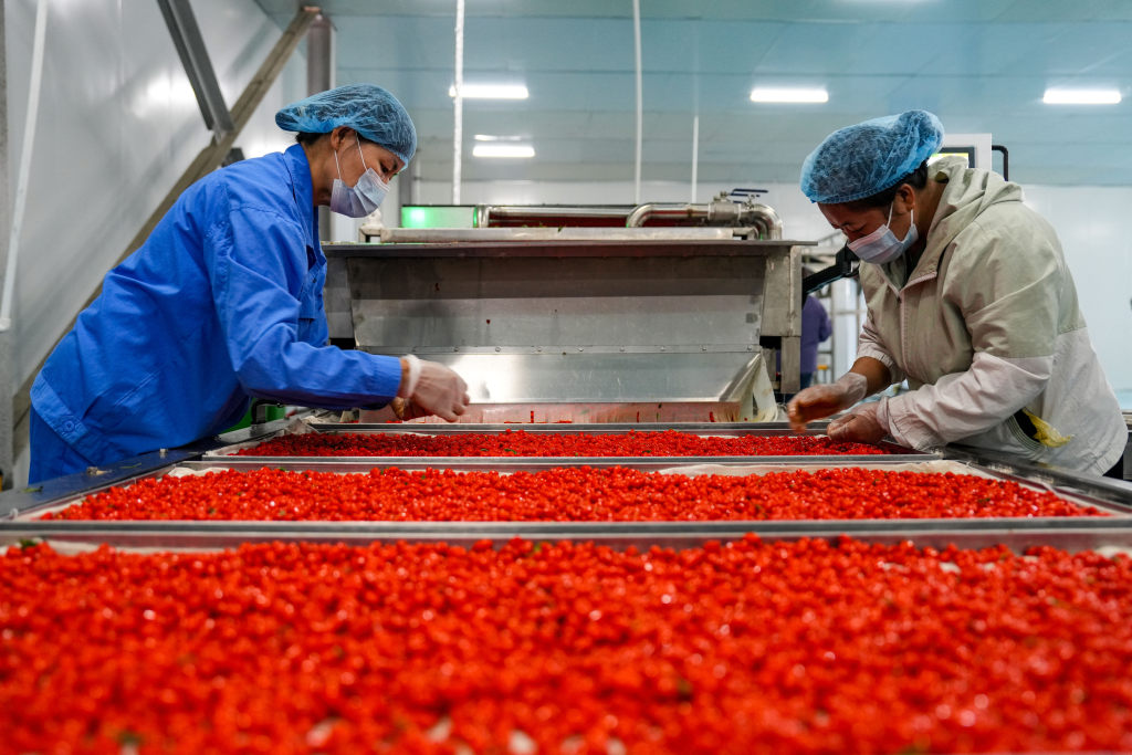 9月16日,新疆维吾尔自治区博尔塔拉蒙古自治州精河县杞明星枸杞产业发展有限公司,工人在枸杞加工生产线上作业。