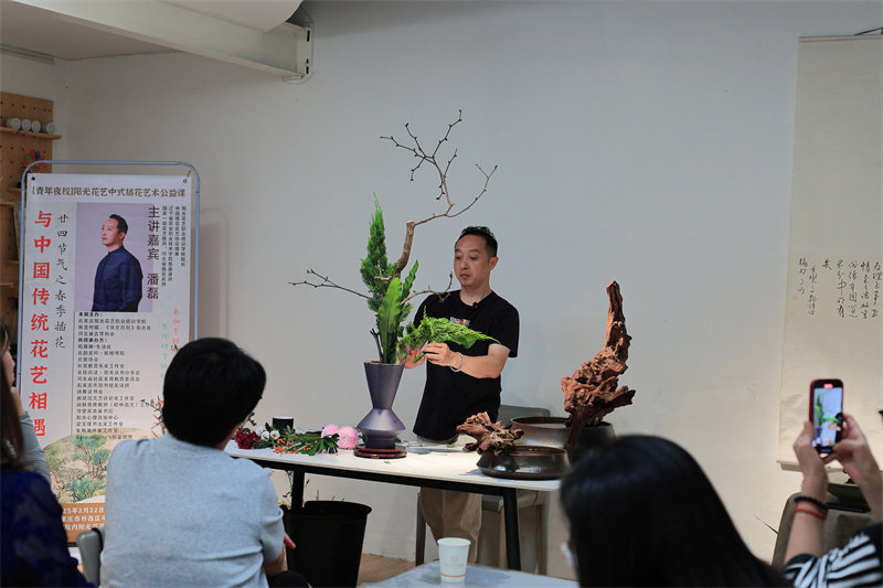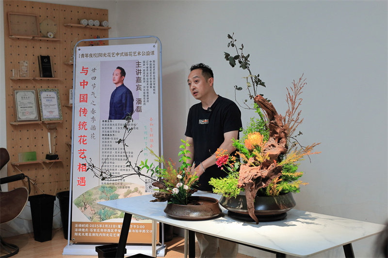 9月12日,在石家庄阳光花艺课堂,中国插花花艺协会理事潘磊正在分享盘花创作理念。