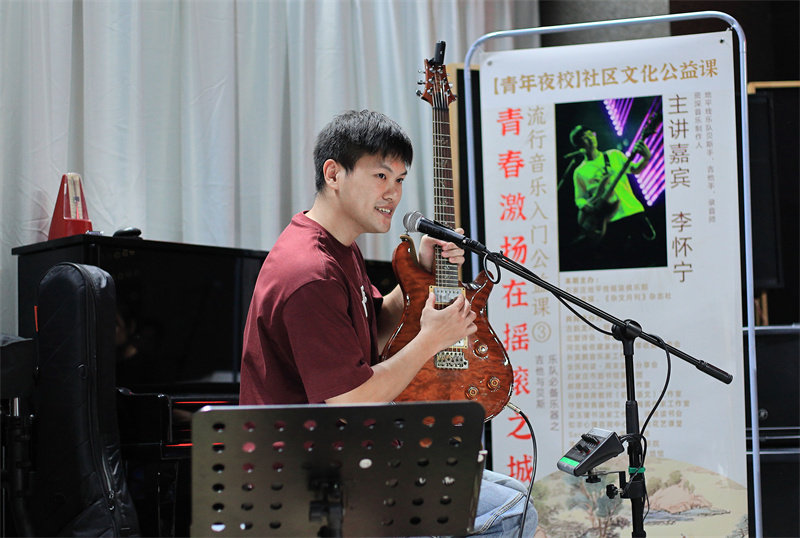 活动当晚,吉他教师刘静涛从结构组成、持琴姿势和演奏方式等角度入手,为学员们讲解了民谣吉他基础知识。“每当夕阳西沉的时候,我总是在这里盼望你……”《外面的世界》旋律随之响起,歌曲节奏婉转起伏,征服了大家的耳朵。