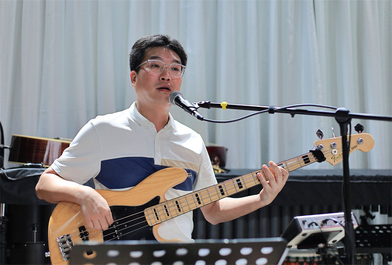 地平线摇滚乐队李怀宁老师则以击勾弦的弹奏方式连弹音节,为大家呈现了贝斯沉郁浑厚的音色,凸显了低音部分在摇滚乐队中的衔接作用。原本风格甜美的《小星星》在李老师的贝斯演绎下,鲜明的反差感瞬间吸引了大家。