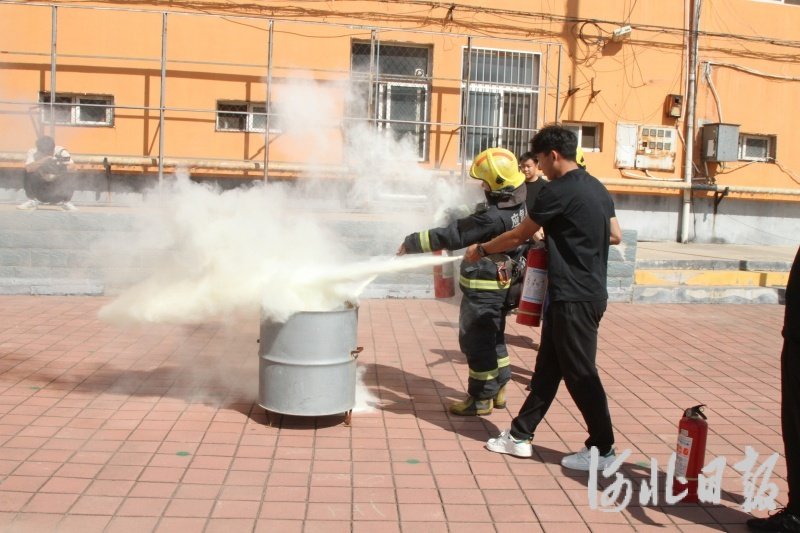 图为师生代表和消防员使用灭火器灭火。刘唯清摄