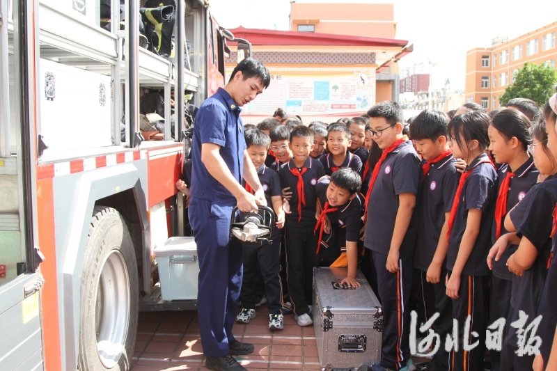 图为消防员给同学们讲解消防装备。刘唯清摄