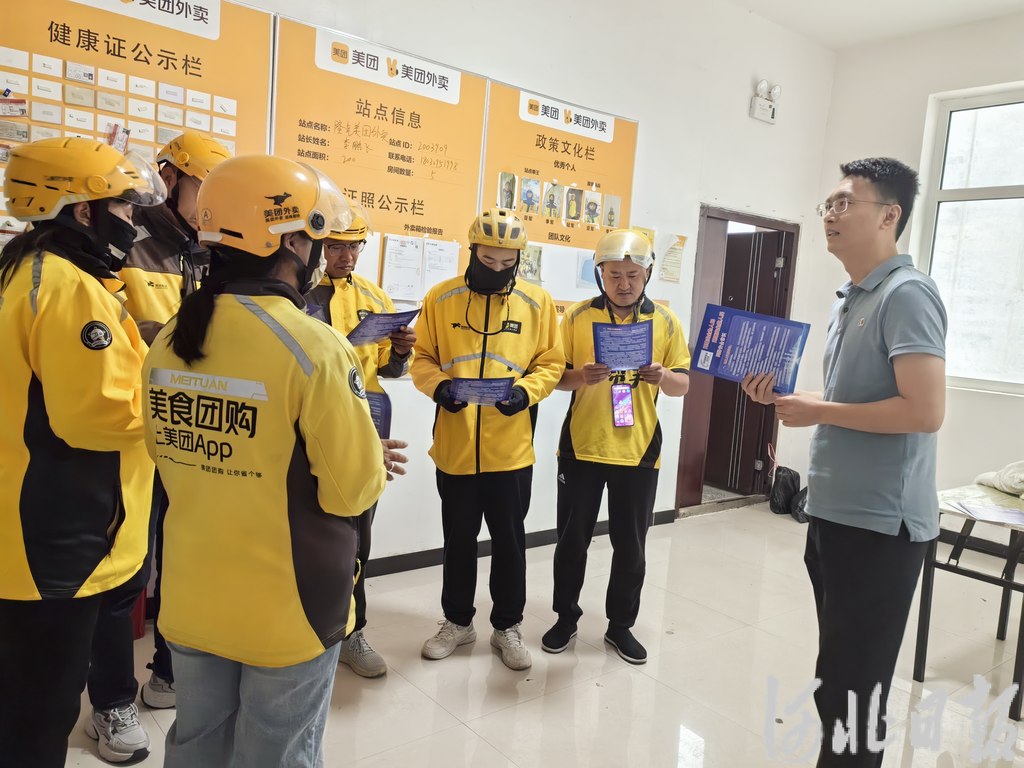 河北日报客户端讯(闫德见、潘志方)“客户要求先转账,平台之外别乱想;退款要走正规渠道,私发二维码是圈套……”9月17日,隆尧县新华路美食广场,隆尧县委社会工作部工作人员通过通俗易懂的语言,向外卖小哥主动宣传网络安全知识,提升他们的防护意识与技能。