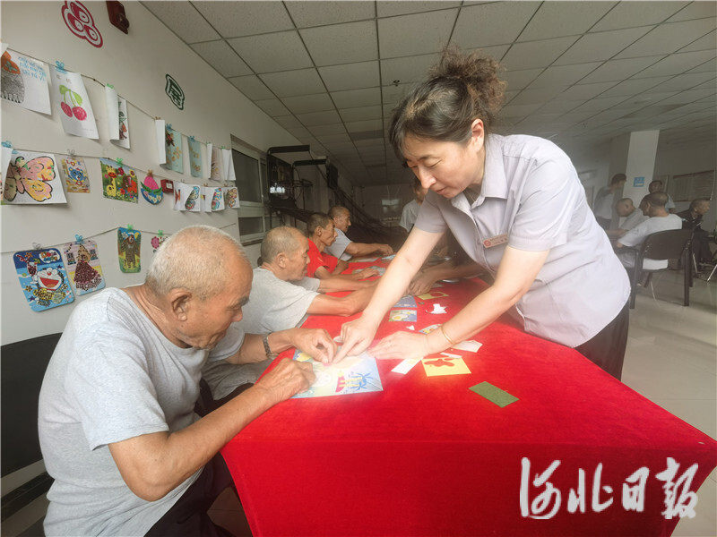 9月15日,在海港区老年人服务中心,护理人员与老人一起做手工。河北日报、河北日报客户端记者孙也达摄