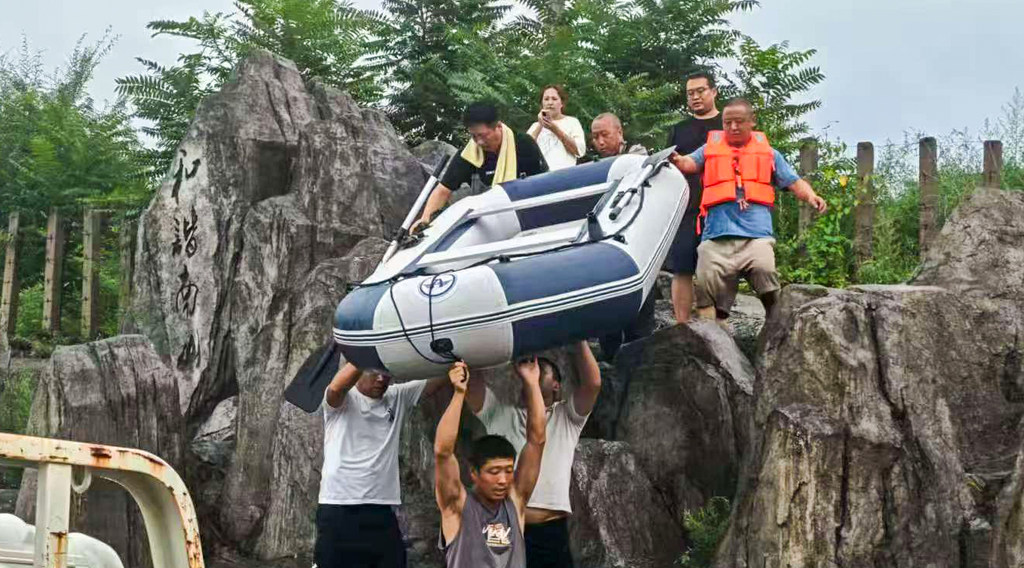 7月26日,陈栅子镇工作人员和南山根村干部一起,正在运送皮划艇。受访者供图