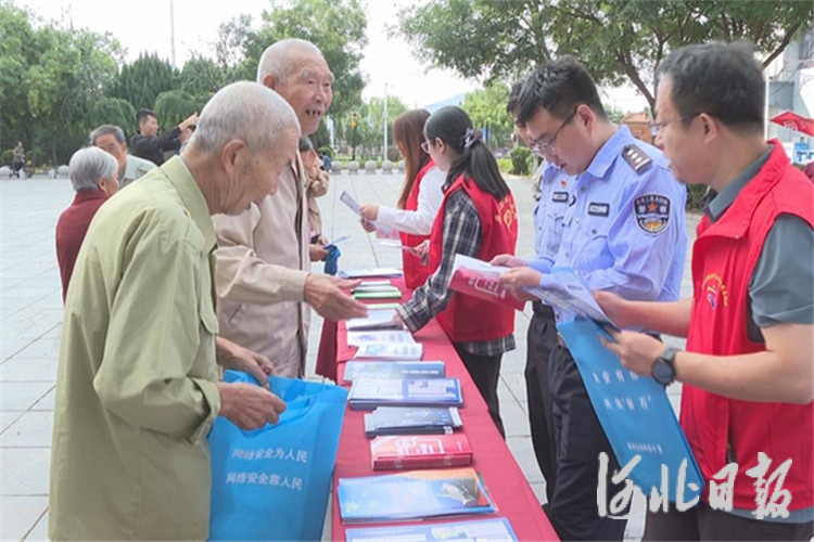 9月18日,石家庄市鹿泉区委网信办、国安办、公安局和妇联等部门,在获鹿镇西门广场联合开展国家网络安全宣传周集中宣传活动,工作人员通过摆放展板、设置咨询台、发放宣传手册、互动讲解、现场答疑等方式,向市民普及网络安全知识。滕欢、芦玉龙摄影报道
