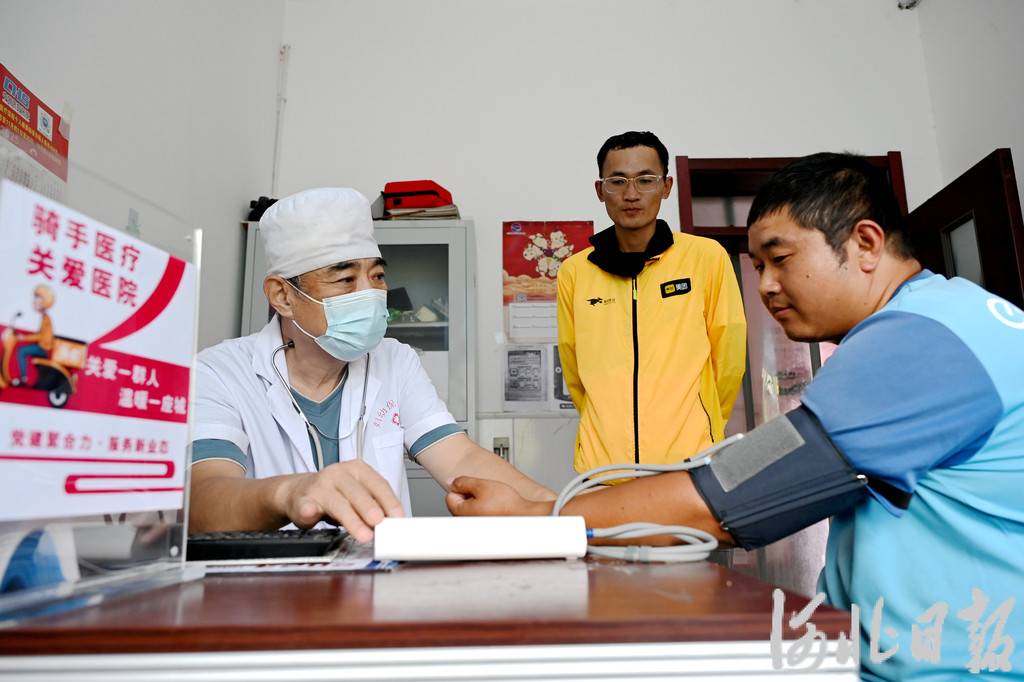 9月15日,武强县“骑手医疗关爱医院”,医生正在为外卖骑手测量血压。河北日报记者 焦磊摄