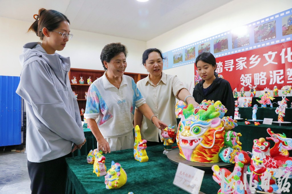 9月17日,玉田县文化馆工作人员(右二)向参观者介绍玉田泥塑作品。河北日报记者师源摄
