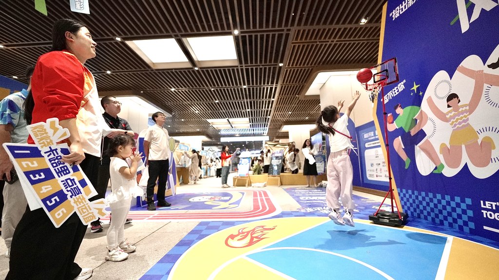 在体育快闪体验区,小朋友正在进行投篮挑战。