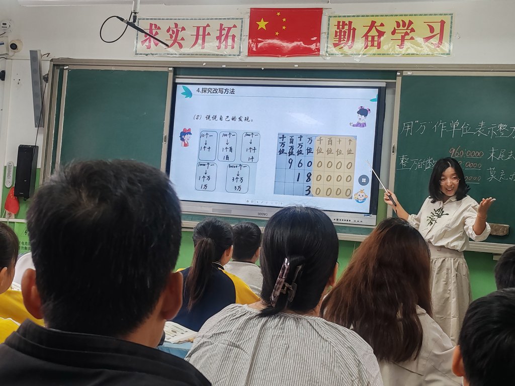 在课堂上,支教教师张瑜执教四年级数学“整万数的改写”,以速记比赛激发兴趣,探究体验“一百万”,借助测量法渗透“化归思想”,引导学生通过观察、猜想、验证总结改写方法,注重知识生成与思维训练。