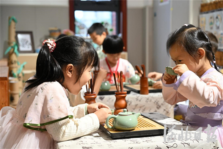 柏林幼儿园则以“品秋茶,享丰收”为主题,为孩子们打造了一场充满童趣的节气体验。活动中,老师首先用浅显易懂的语言向孩子们介绍秋分与丰收的关联,展示水稻、玉米等农作物模型,让孩子们直观感受“丰收季”的含义。同时,幼儿园精心准备了适合儿童饮用的温和秋茶,老师引导孩子们观察茶叶形态、闻茶香、尝茶味,在轻松愉快的氛围中体验传统茶文化。