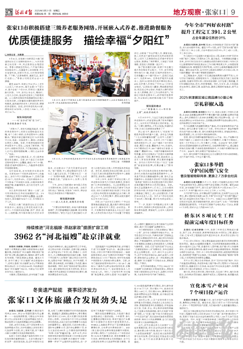 张家口市全力推进县、乡、村三级养老服务体系建设。目前,19个县区已实现养老服务指导中心全覆盖,建成179个乡(镇、街道)区域养老服务中心,为基层养老服务网络搭起骨架。