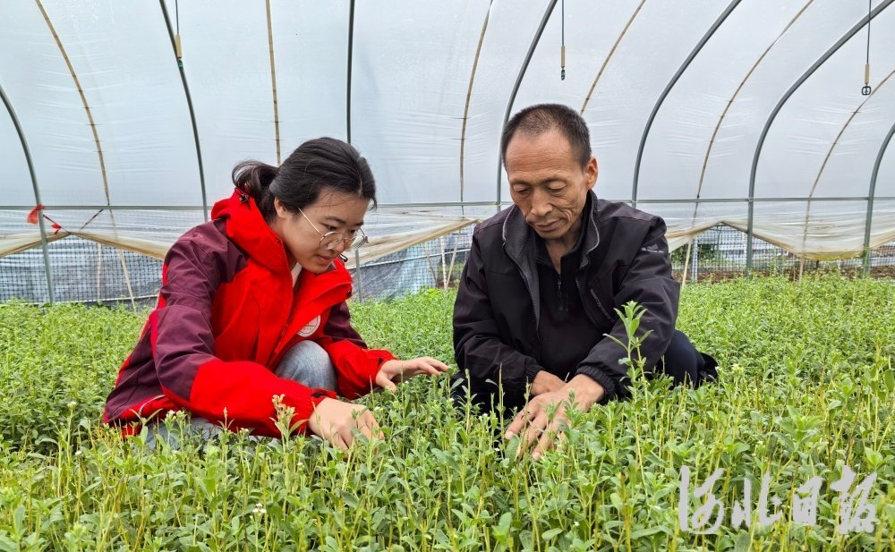 9月23日,曲周县岳庄村甜叶菊育苗大棚,中国农业大学硕士研究生方世璟(左)和岳庄村党支部书记、村委会主任卜新月一起查看苗情。河北日报记者孙青摄