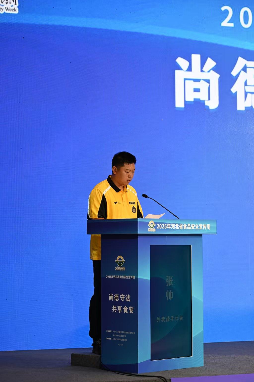 近日,在河北省食品安全宣传周主场活动现场,参与活动的外卖骑手代表向广大骑手发出倡议,呼吁骑手做守护城市食品安全的“移动探头”,为食品安全监管提供更广泛精准的线索。