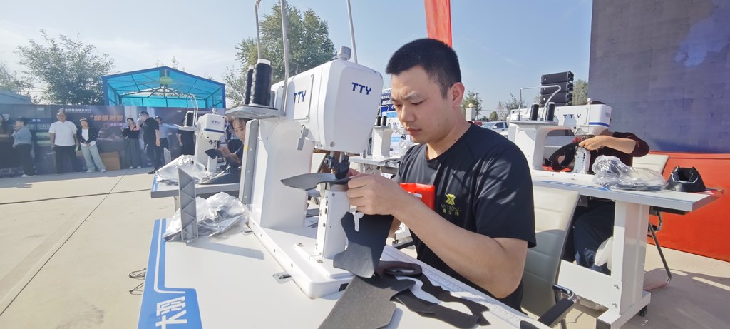 9月26日,雄安新区第三届“三台鞋匠”劳务品牌专项职业技能大赛暨劳务品牌文化展示会成功举办。图为参加技能大赛的选手正在进行鞋面缝合比拼。河北日报记者 曹铮 摄