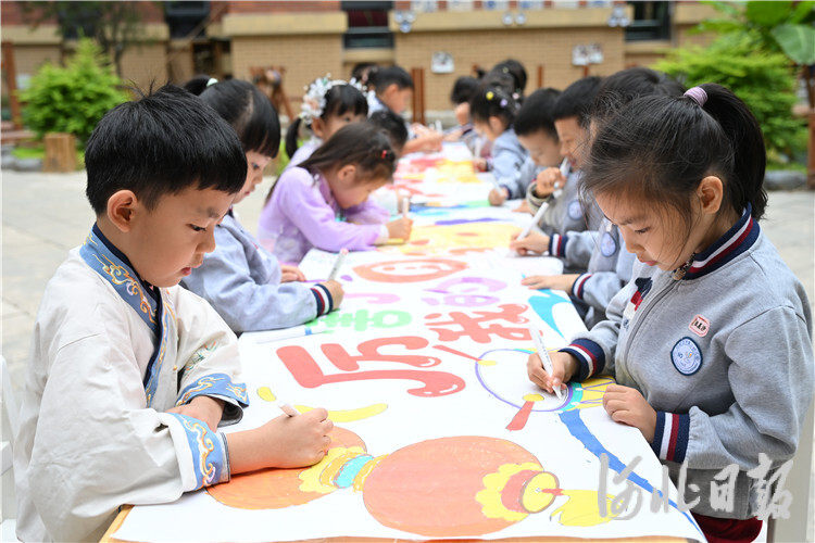 9月23日,石家庄市新华区柏林幼儿园的孩子们在“绘长卷迎国庆”活动中绘画。