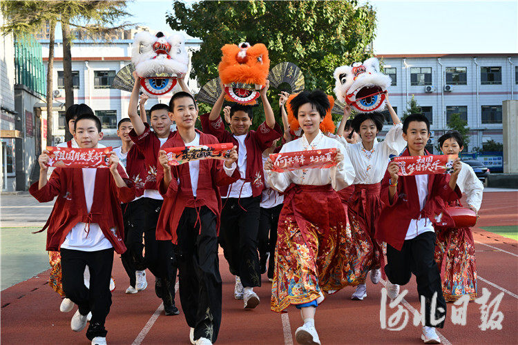 9月25日,在石家庄市第二十八中学开展的国庆主题系列活动上,中学生在舞狮。