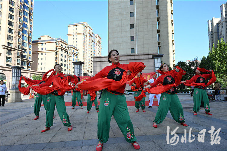 9月24日,在石家庄市新华区天苑街道综合文化站举行的迎国庆惠民演出中,居民们表演舞蹈。