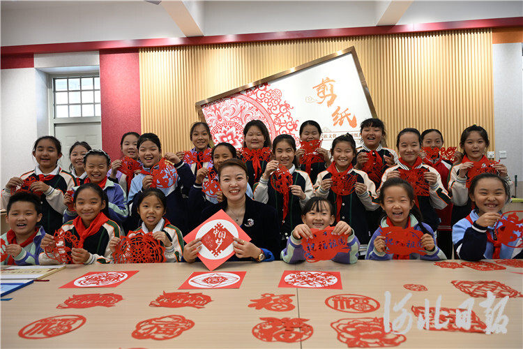 9月24日,在石家庄市天苑小学,孩子们展示“迎国庆”为主题的剪纸作品。