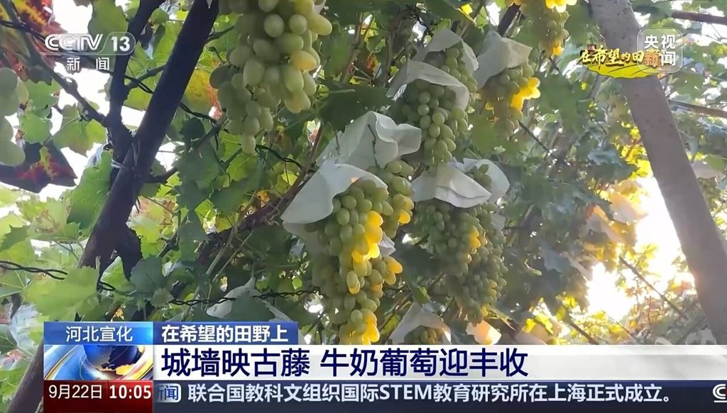 9月22日,央视新闻频道《在希望的田野上|河北宣化:城墙映古藤 牛奶葡萄迎丰收》报道截图。