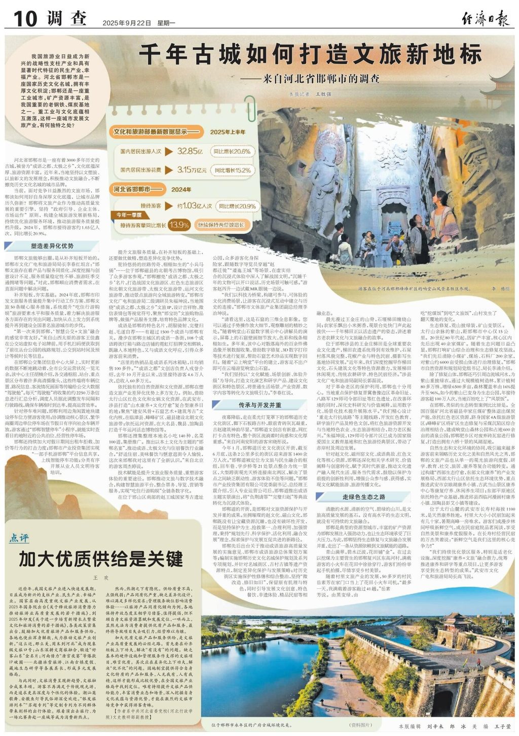 9月22日,《经济日报》推出整版报道《千年古城如何打造文旅新地标——来自河北省邯郸市的调查》。文中说,河北邯郸依托丰富的历史文化和旅游资源,积极推动文旅融合,不断擦亮历史文化名城名片。面对旅游市场同质化竞争激烈等问题,邯郸通过构建智慧旅游平台、优化交通与停车服务等方式补齐短板。同时,依托“成语之都”“太极之乡”独特文化IP,打造战国文化旅游区、红色生态旅游区和北朝文化旅游带、太极文化旅游带等。在资源保护方面,注重对历史文化街区、红色旧址的科学保护与利用。作为资源型城市,邯郸大力推动生态修复,将紫山等废弃矿山区改造成生态公园,发展康养旅游,走出了一条生态与文化协同的高质量发展新路。
