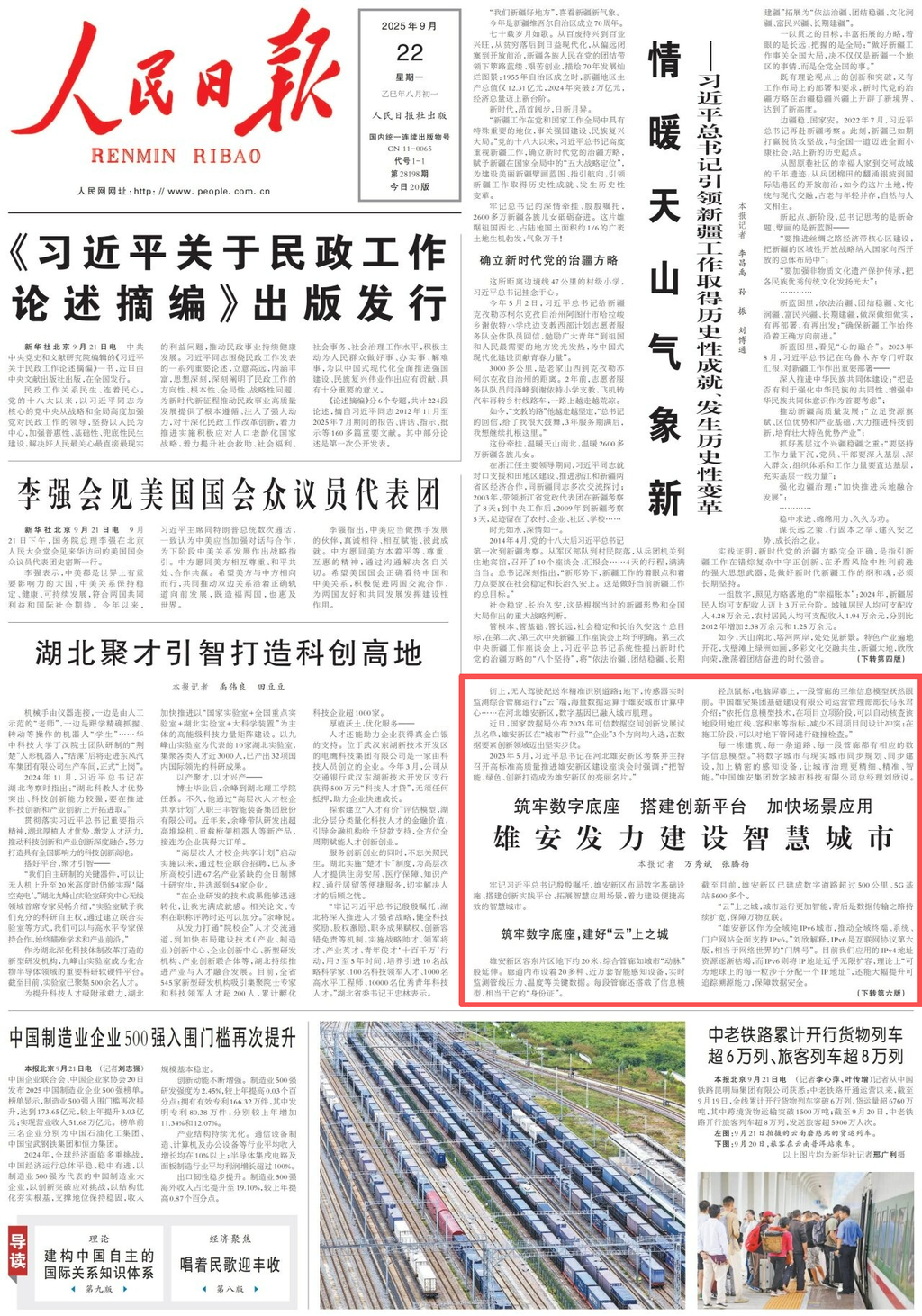 9月22日,《人民日报》在一版推出《雄安发力建设智慧城市》。据报道,国家数据局公布2025年可信数据空间创新发展试点名单,雄安新区在“城市”“行业”“企业”3个方向均入选,标志着其在数据要素创新领域迈出坚实步伐。雄安新区通过布局数字基础设施、搭建创新实践平台、拓展智慧应用场景,着力建设智慧城市。目前雄安新区已建成数字道路超过500公里、5G基站5600多个,雄安城市计算中心已汇聚各类数据超过330亿条,为城市精细化治理提供强大算力支撑。在社区治理、交通、政务等领域,智能表具预警独居老人异常、多功能信息杆优化交通、DeepSeek接入城市计算中心等数十项应用已落地,生动展现了“数字驱动、智慧赋能”的雄安实践。