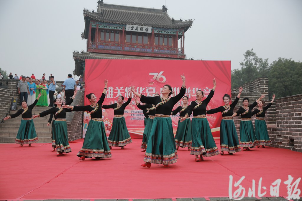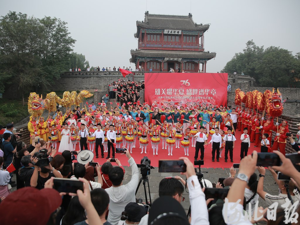 开场歌舞《长城颂》展现山海关“一夫当关,万夫莫开”的气魄。快板《古城览胜》、少儿舞蹈《追光少年》,展现关城百姓安居乐业的精神风貌;歌曲联唱《我和我的祖国》《歌唱祖国》引发全场大合唱,吸引众多游客驻足观赏、拍照打卡。