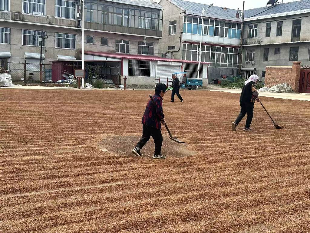 收割完成的高粱,很快被运到村里的晒场。走进晒场,成片的红高粱铺满了水泥地,村民们戴着头巾、推着耙子,来回翻动高粱,让每一粒粮食都能充分接触阳光。“晒高粱讲究‘勤翻晒、防受潮’,白天要翻三四遍,晚上得盖好塑料布,这样才能保证粮食干燥,不发霉。”一位正在晾晒的村民一边翻晒,一边介绍。