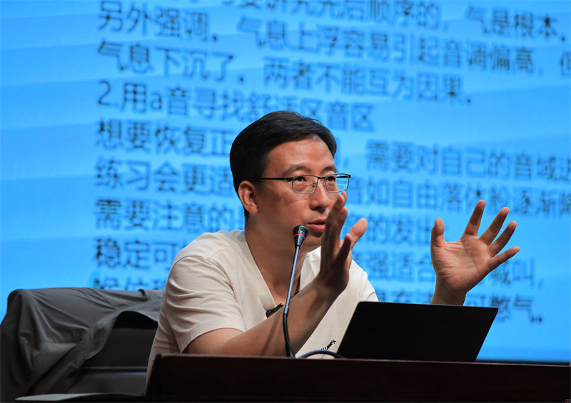 为了帮助大家更好地区分“声音发虚”和“虚声”两种概念,李明从产生原因、音质特征、表达功能以及运用要求四个维度做出对比分析。他认为,解决声音发虚问题需要避免朗读时呼吸过浅,通过建立正确实声感受,强化口腔共鸣练习,在发音时感受上颚前段被气流冲击所产生的“酥麻”感。对此,学员们通过单元音、四字词语和虚声朗读练习,切实体会声音着力点,提升吐字发声准确程度。