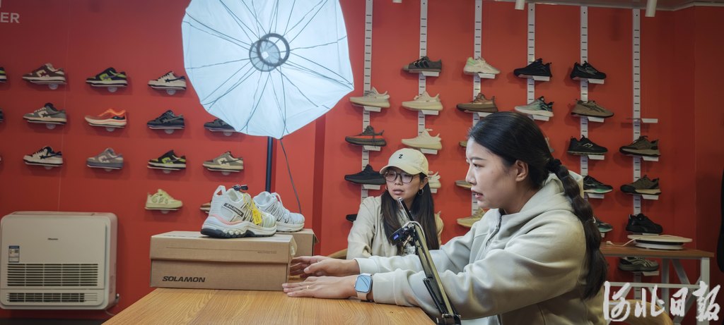 9月26日,位于雄安新区安新县三台镇的“三台鞋匠”品牌运营中心内,主播正在向网友介绍一款本地鞋企生产的休闲鞋。河北日报记者 曹 铮摄
