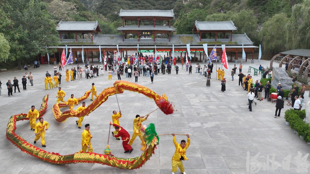 9月20日,涞水野三坡百里峡景区入口处,舞龙表演吸引游客驻足。 河北日报记者 寇国莹摄