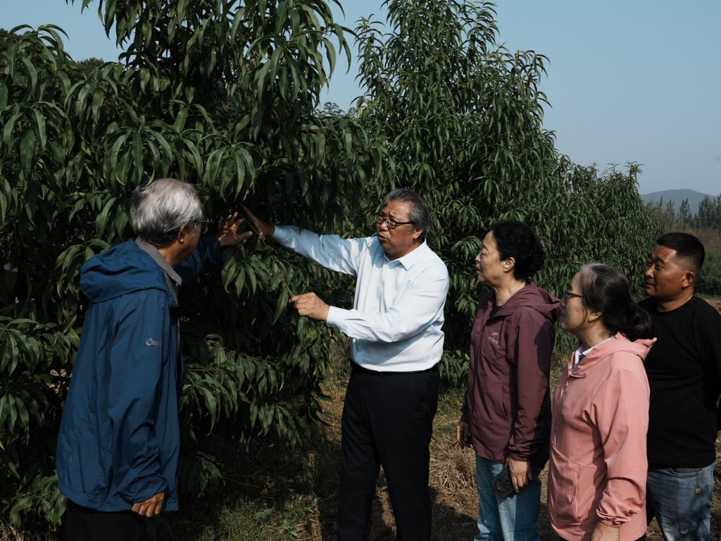 9月30日,滦州市鸡冠山生态园区内,河北省桃产业技术体系首席专家、河北科技师范学院教授张立彬(左二)在指导桃树秋季管理。