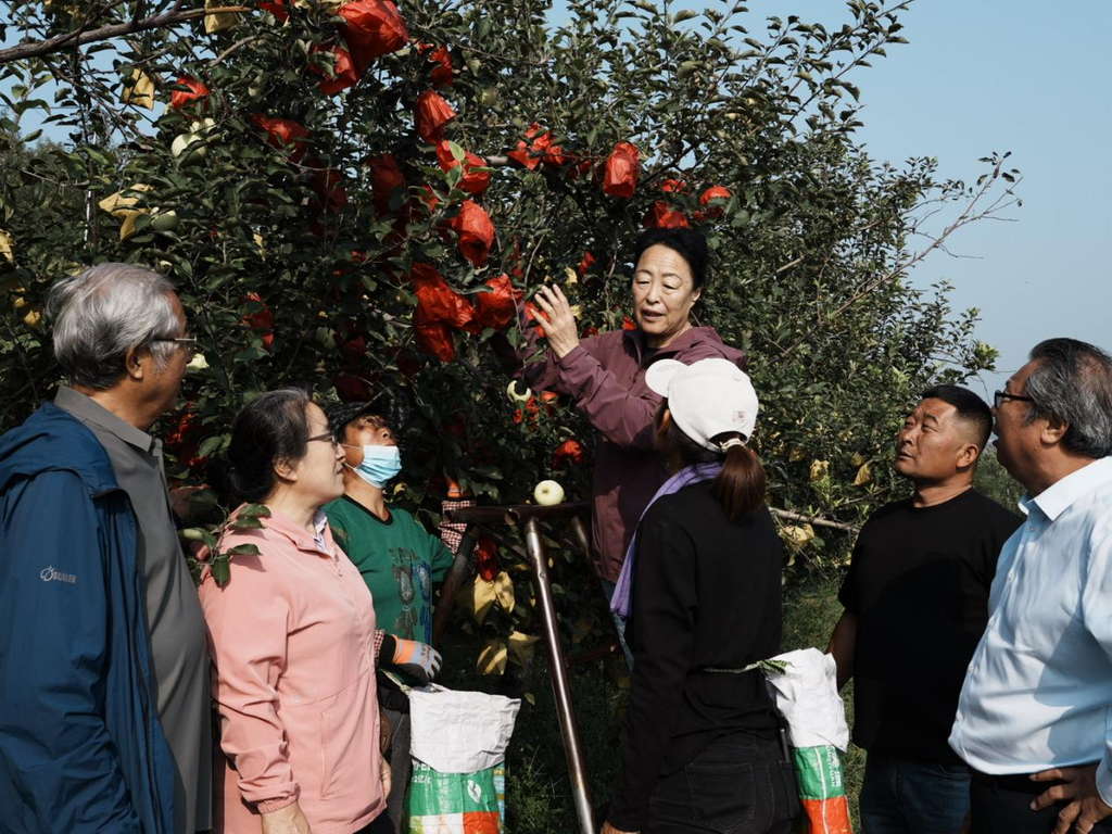9月30日,滦州市鸡冠山生态园区内,河北农业大学研究员郭素萍正在给农户讲解苹果去袋技术。