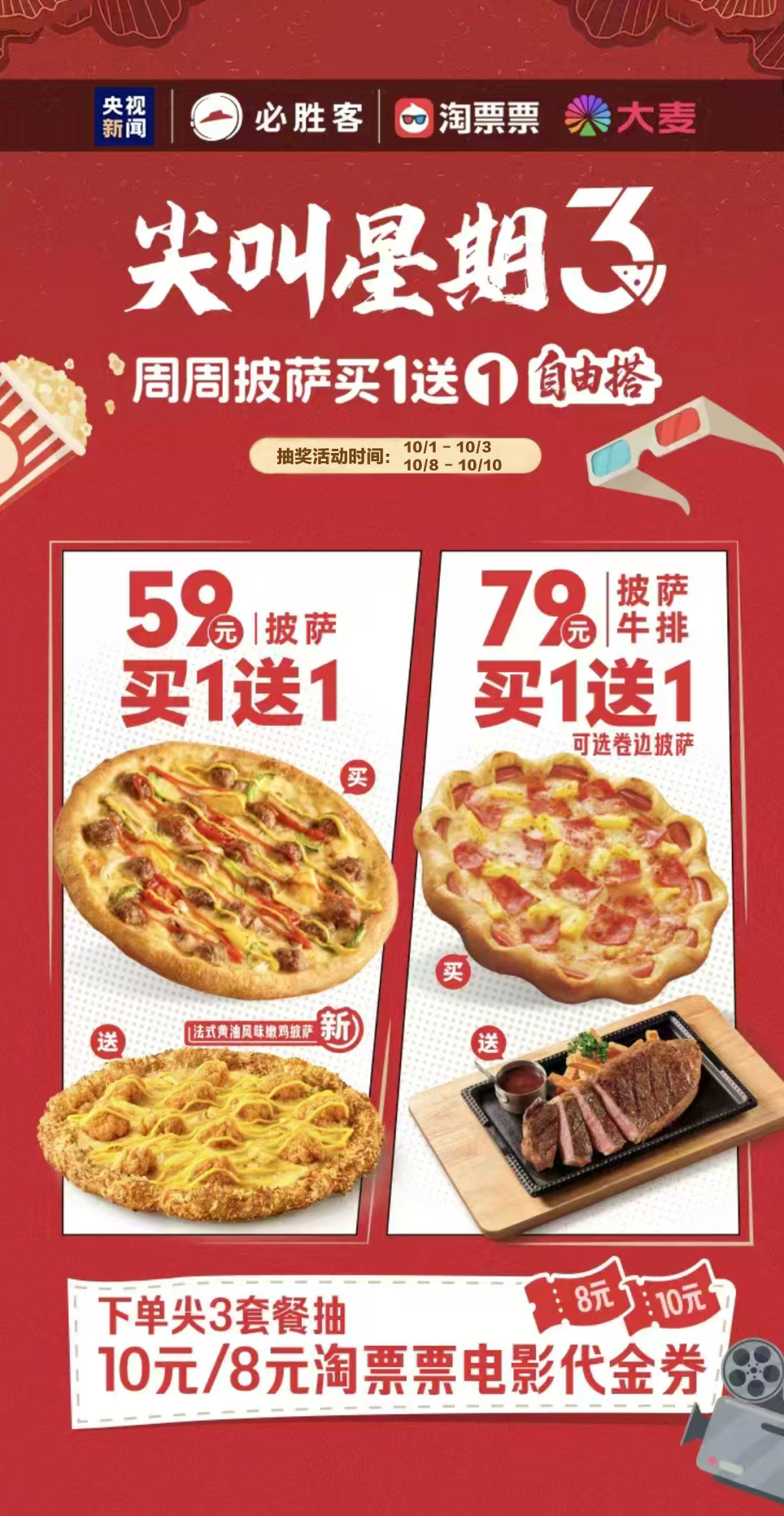 央视新闻联合必胜客、淘票票,共同推出“电影+”消费活动。10月1日(周三)、8日(周三)通过必胜客App、微信小程序,购买尖叫星期三“买一送一”相关产品;或选购同款两件套组合券,并成功核销使用,即可获得抽奖资格。