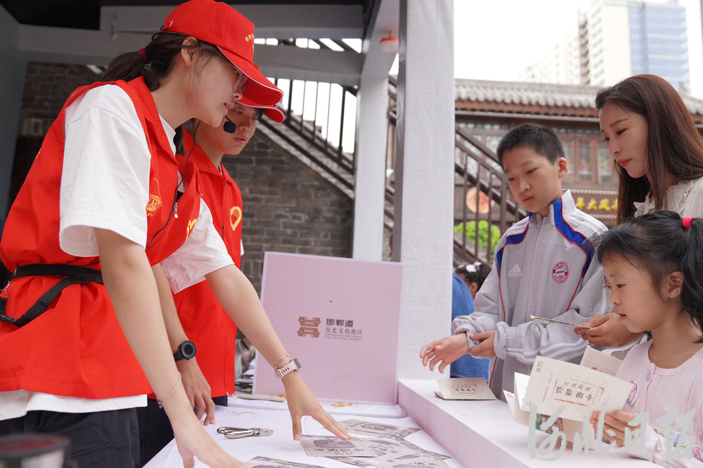 10月1日,志愿者在邯郸道历史文化街区为游客讲解邯郸历史文化。