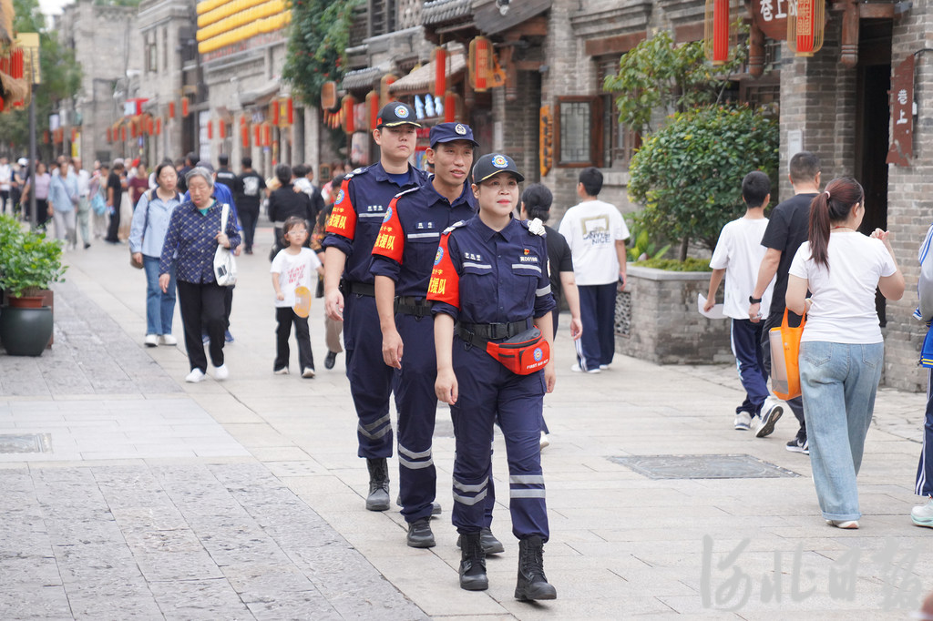 10月1日,邯郸红十字蓝天救援队志愿者在邯郸道历史文化街区提供应急保障服务。