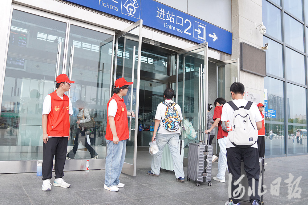 10月1日,志愿者在邯郸高铁站引导旅客进站。