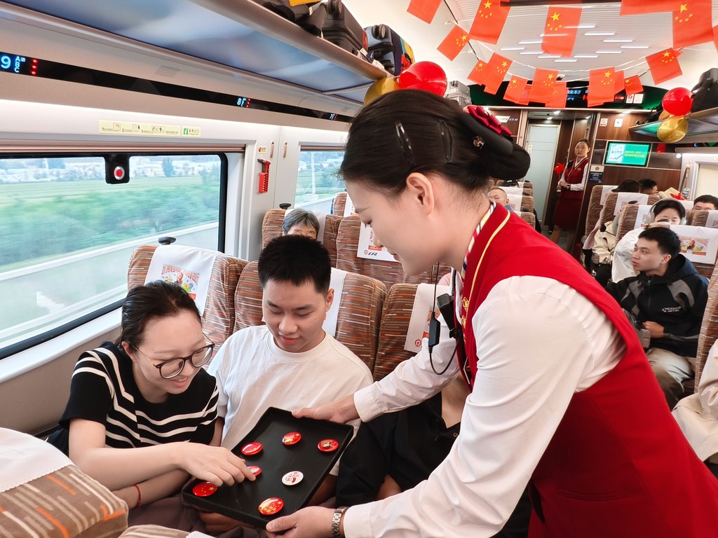列车飞驰向前,车厢内飘扬的国旗、贴满的祝福语与旅客们的灿烂笑容,不仅为国庆旅途增添了欢乐色彩,更在互动中传递着浓厚的家国情怀。