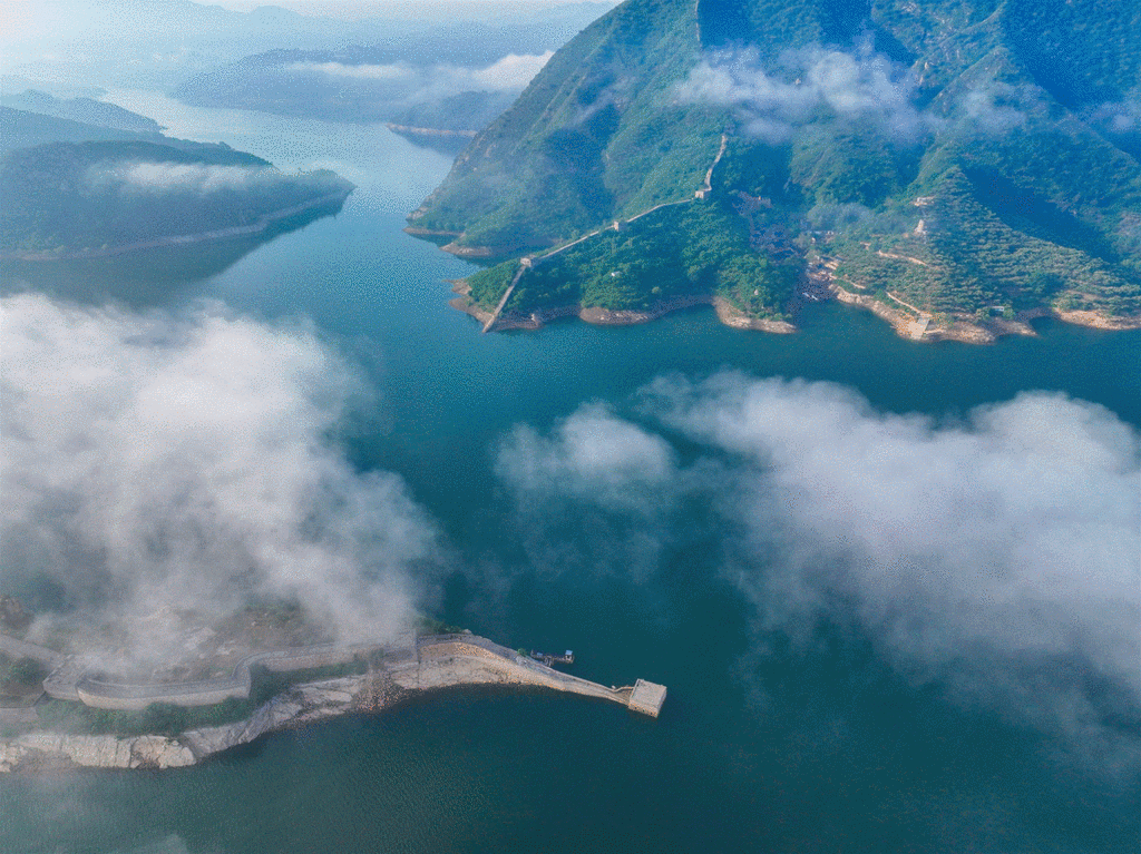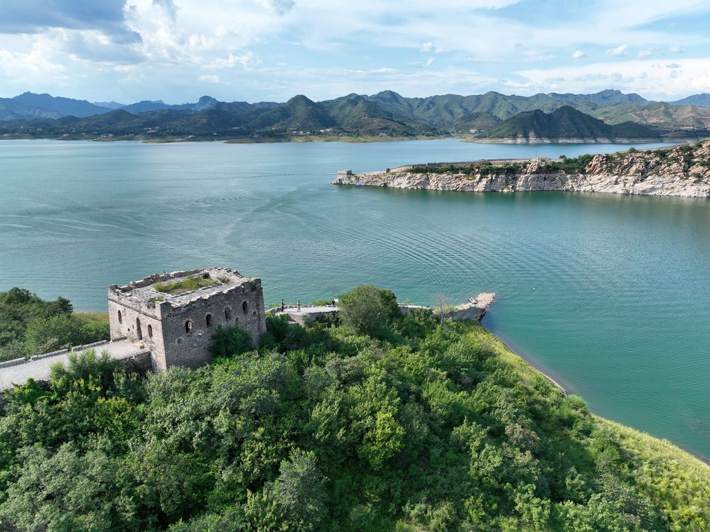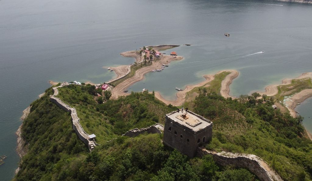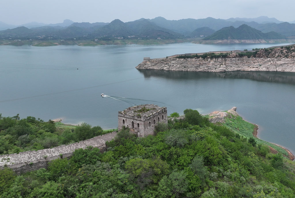 7月13日,在宽城满族自治县境内的潘家口水库,游客乘船欣赏露出水面的长城(无人机照片)。新华社资料片