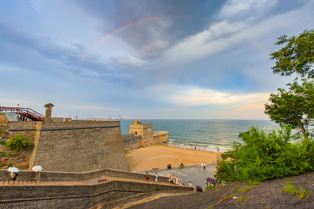 8月7日,雨后的老龙头景区内,彩虹、长城、大海共同构成一幅美丽的图画。王金磊摄